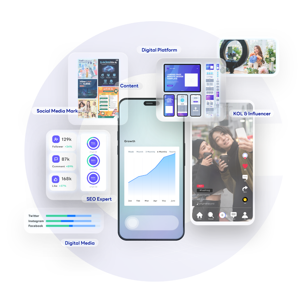ออกแแบกลยุทธ์การตลาดที่สามารถสื่อสารกับกลุ่มลูกค้าได้อย่างมีประสิทธิภาพ ผ่านแพลตฟอร์มโซเชียลมีเดียต่าง ๆ เหมาะสำหรับใช้เพิ่มการเข้าถึง กระตุ้นการมีส่วนร่วม ขยายการรับรู้แบรนด์ ใช้สื่อสารกับกลุ่มลูกค้า แคมเปญ ตลอดจนกระตุ้นยอดขาย